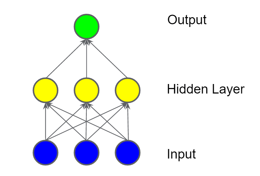 The blue circles are input features and the green ones are representing the weighted sum of the inputs. Let’s add a Hidden Layer (yellow) to this network to improve its ability to deal with non-linear problems.